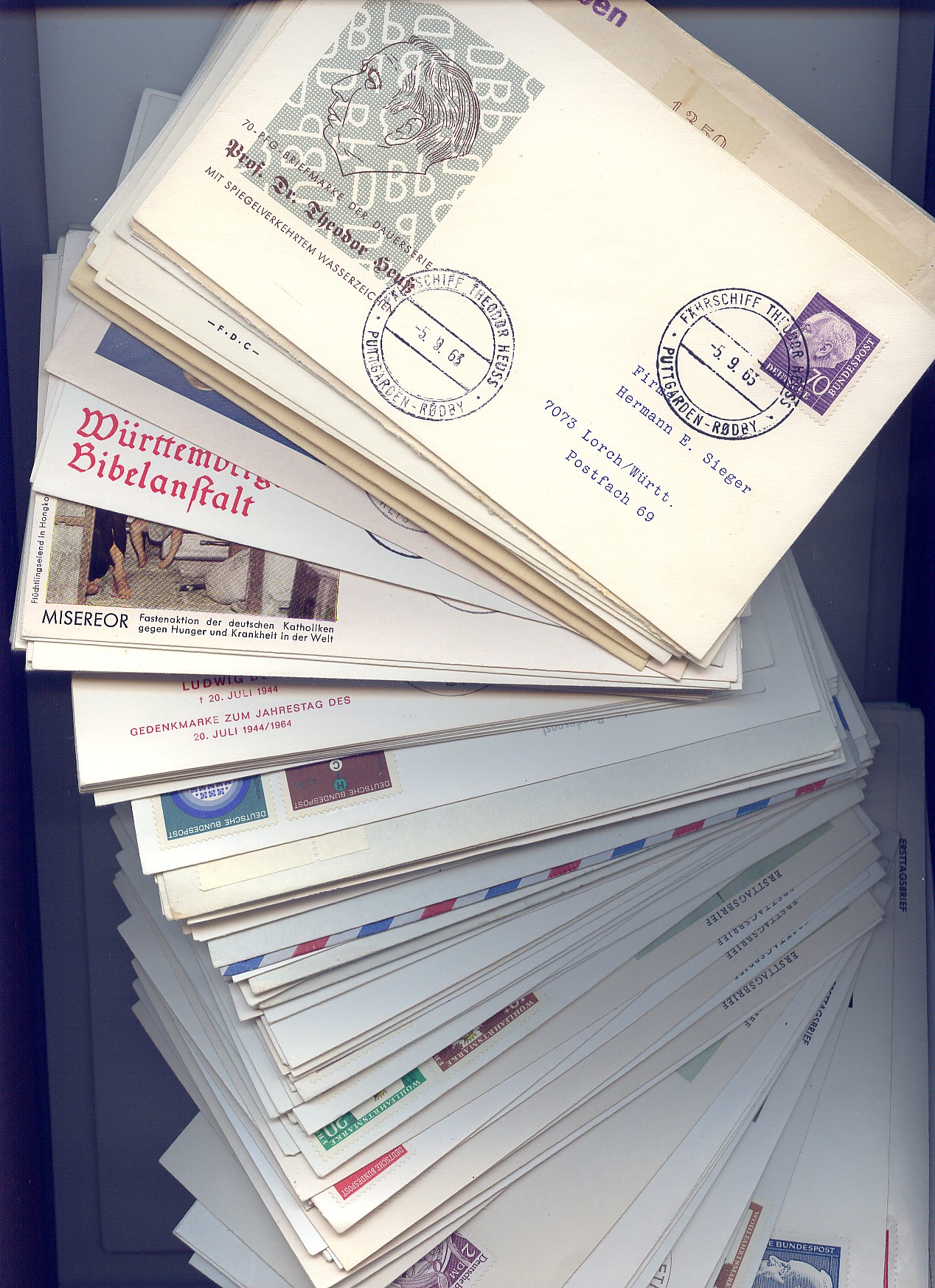 Ich habe in meinem Nachlass einige davon, die lediglich 3 x den Ausgabesonderstempel tragen, aber nicht auf einem Brief oder einer Pappkarte aufgeklebt sind.