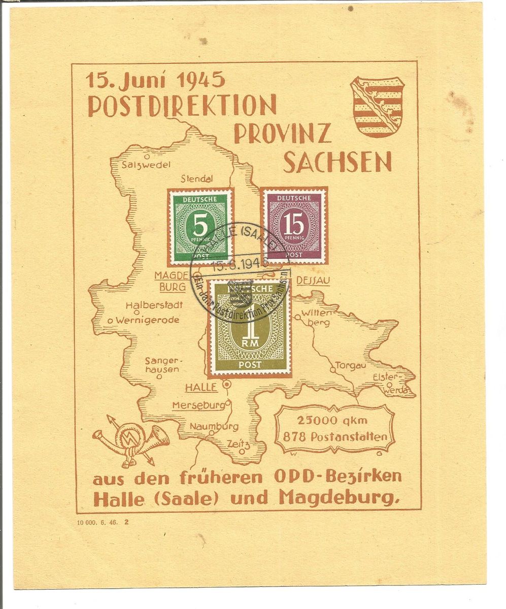 Schmuckblatt mit Sonderstempel Halle (Saale) vom 15.06.1946 Ein jahr Postdirektion Prov. Sachsen.