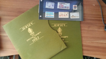 Erstes Objekt: Jersey Jahrbuch 1987, augenscheinlich komplett mit Marken, die sind allerdings noch Original zu und übereinander gesteckt, sehe deshalb nicht alle. Der Schuber hat einen kleinen Knick unten rechts. Klemmtaschen incl. siehe die 2 Fotos