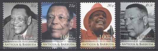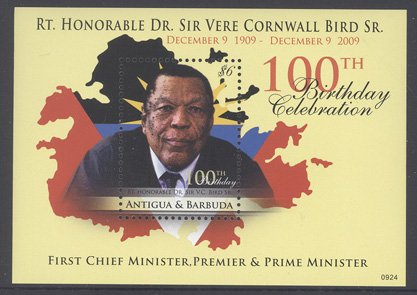 Antigua hat 2009, wohl im Dezember, Marken und 2 Blöcke anlässlich des 100. Geburtstages des 1. Premierministers Dr. Vere Cornwall Bird verausgabt (siehe Bilder).
