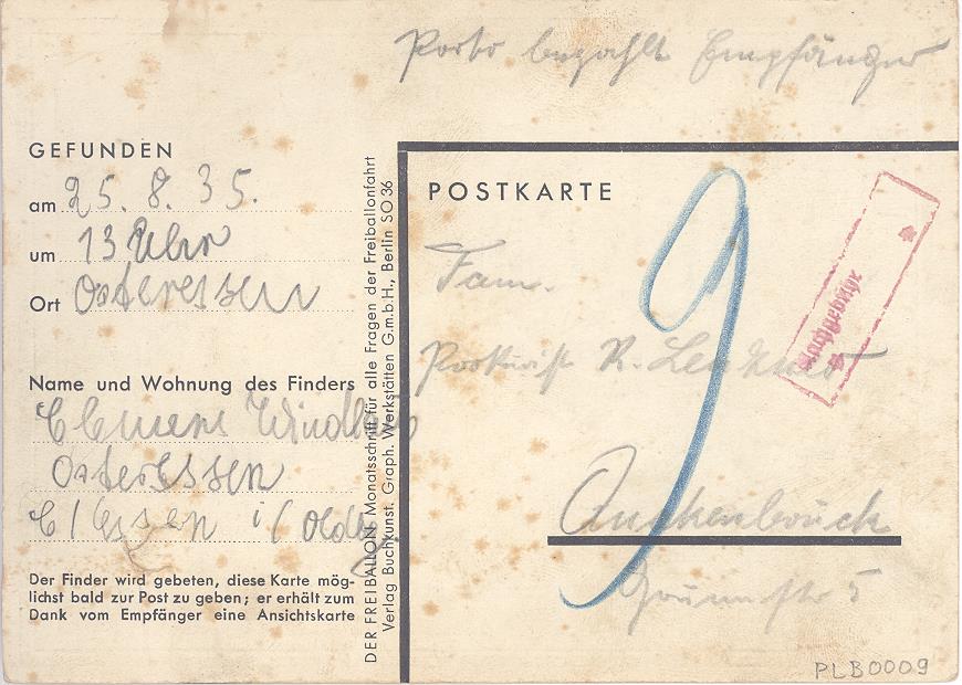 Diese Karte ist am 25. 8. 1935 im Ballon Liebefeld in Quakenbrück aufgestiegen