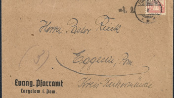 Inlandsbrief im Fernverkehr bis 20 g vom 1. Februar 1946 aus Torgelow nach Eggesin. Der Brief wurde portorichtig in Einzelfrankatur mit 12 Reichspfennigen (1 x Mi.-Nr. 18 - Ausgabe vom 20. Dezember 1945) frankiert und mit dem Kreisstegstempel mit Gitterbogen oben und unten ohne Datumswerk TORGELOW / * * * abgeschlagen.