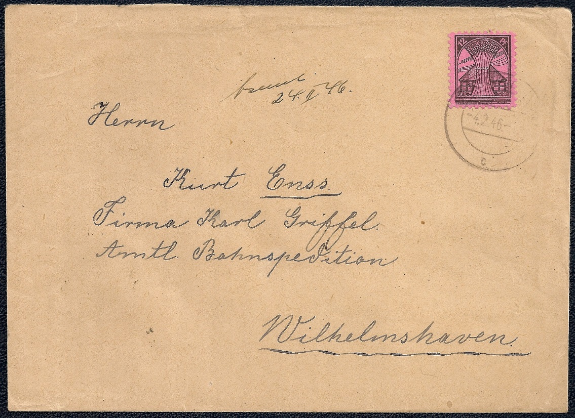 Inlandsbrief im Fernverkehr bis 20 g vom 4. Februar 1946 aus Grabow nach Wilhelmshaven. Der Brief wurde portorichtig in Einzelfrankatur mit 12 Reichspfennigen (1 x Mi.-Nr. 16 - Ausgabe vom 28. August 1945) frankiert.