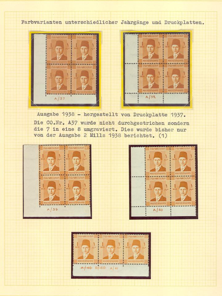 Die Dauerserie "König Faruk"(Boy King) wurde von vier Druckplatten in einem Druckbogen hergestellt. Die Zähnung des Druckbogens erfolgte mittels Kammzähneung. Davon wurden dann vier Schalterbogen geschnitten.An hand von Vierer-Eckstücken zeige ich die vier Typen der Randzähnung.